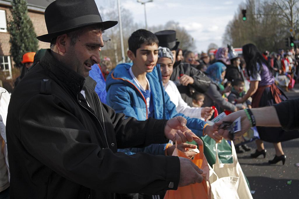 FLUECHTLINGE_KAMELLE_JS7368 angekommen im rheinischen Karneval - enjoying carnival parade collecting sweets and flowers |