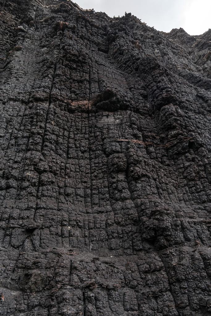 BRAUNKOHLE_WAND_HAMBACH_JS134 Wand von Braunkohle darin eingelagerte Einschluesse aus Pflanzenteilen Baeumen erdgeschichtlicher Urwaelder Braunkohle Abraum Tagebau Hambach Rheinisches Braunkohlerevier Bagger Schaufelrad mit 21 Meter Durchmesser Braunkohle Erdreich, geologische Schichten in etwa 250m unter Meeresspiegel , de Tagebau ist Europas groesster, danach soll hier der zweitgroesste See in Deutschland entstehen |
