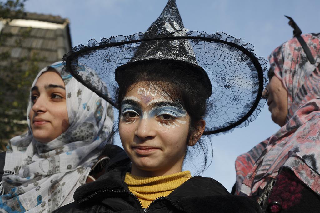 MAEDCHENMUSLIMA_KARNEVAL_JS7304 angekommen von Afghanistan im rheinischen Karneval - enjoying carnival parade collecting sweets and flowers |