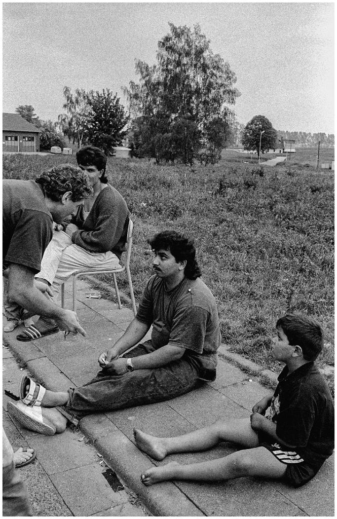 GYPSIES_GZW_190593JS20 Migranten hauptsaechlich aus Osteuropa, Roma, sind voruebergehend in dem fast verlassenen Dorf GARZWEILER untergebracht, das wegen des Braunkohle Tagebaus abgerissen werden wird Garzweiler war bis 1980 ein 1200 Seelen Dorf, das dem Braunkohle Tagebau weichen musste. Am 19.5.1993 stehen noch etwa 10 z.T. abbruchreife Gebaeude weitverstreut in der flachen Landschaft, 3-5 alteingesessene Familien leben noch hoechstens 1 Jahr hier bevor sie wegziehen. Etwa 150 Fluechtlinge , zumeist Roma aus Ex-Jugoslawien und Rumaenien fristen hier ein tristes Dasein, weit abgelegen , Asylbewerber auf Abruf. Die alteingesessenen Deutschen lehnen einen Kontakt mit den Fremden ab. Copyright by JO SCHWARTZ / JO-SCHWARTZ .COM |